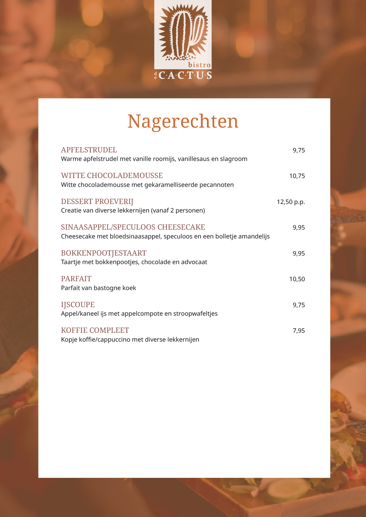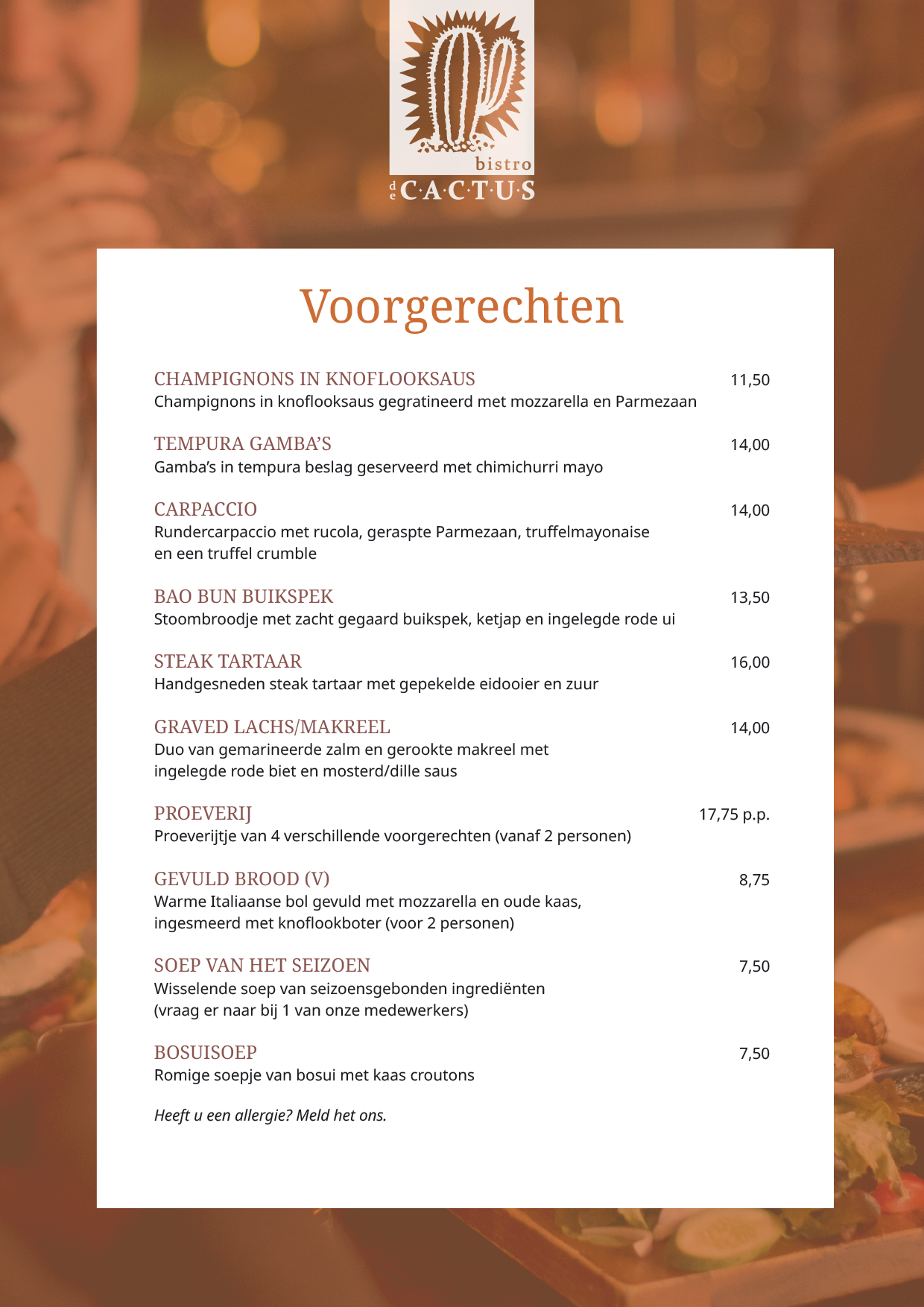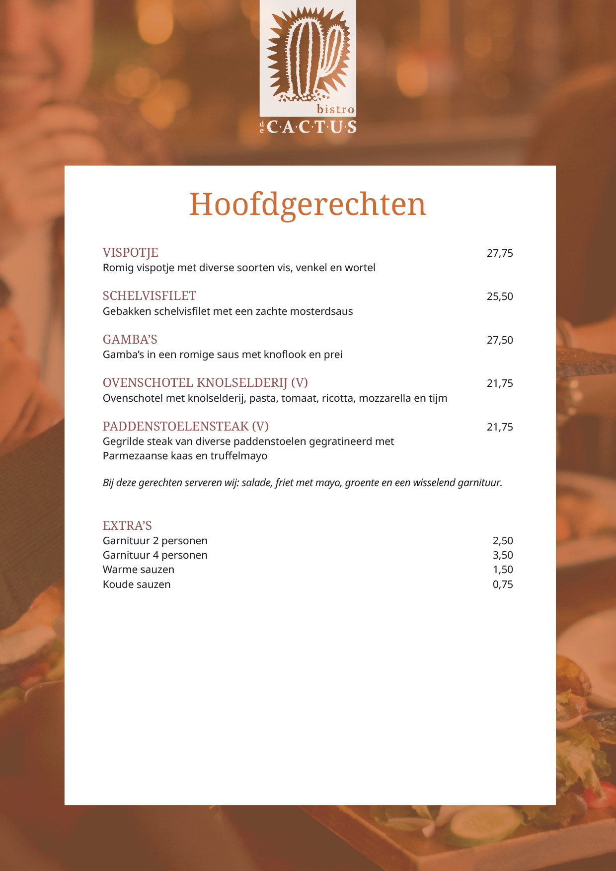 Vragen en speciale verzoeken? Stuur na het plaatsen van uw reservering een mail naar: info@bistrodecactus.nl.